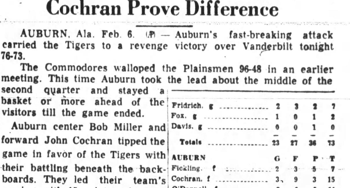 Auburn had lost the previous 13 meetings to ranked opponents. The Tigers spoiled the season-ending game against #7 Vanderbilt, stealing a 74-65 victory.