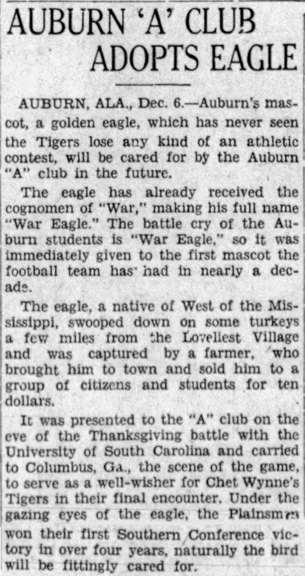 A Mississippi farmer captured the eagle after attacking turkeys a few miles from campus. A group of citizens and students purchased the eagle for $10.